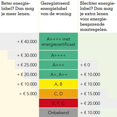 Met een slecht energielabel (E tot en met G) kun je meer extra geld lenen om je huis energiezuiniger te maken. Dit extra geld kun je alleen gebruiken voor bepaalde energiebesparende maatregelen, zoals isolatie, HR-glas of zonnepanelen. De hoogte van dit bedrag hangt af van het energielabel en is maximaal € 20.000 voor een woning met energielabel E, F of G.