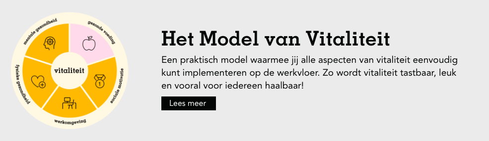 Deze whitepaper is onderdeel van het Model van Vitaliteit: een praktisch model waarmee jij alle aspecten van vitaliteit eenvoudig kunt implementeren op de werkvloer. In het Model van Vitaliteit vind je 5 belangrijke pijlers: mentale gezondheid, fysieke gezondheid, gezonde voeding, sociale motivatie en werkomgeving. Deze pijlers kun je dankzij onze praktische tips en ideeën eenvoudig implementeren bij jou op de werkvloer. Zo wordt vitaliteit tastbaar, leuk en vooral voor iedereen haalbaar!